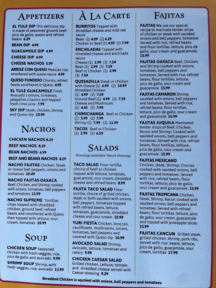 If you’re craving a truly flavorful dining experience, you won’t want to miss the El Tule Menu. Located in the heart of Marble Hill, MO, this hidden gem offers an array of mouth-watering dishes that showcase the rich, vibrant flavors of Mexican cuisine. From sizzling fajitas to fresh, zesty tacos, the menu has something for everyone, whether you’re in the mood for a hearty meal or just a light bite. Each dish is carefully crafted with authentic ingredients and a whole lot of love, ensuring every bite is bursting with flavor. You’ll also find a selection of traditional sides, like guacamole and chips, that pair perfectly with your main dish. Whether you're visiting for a quick lunch or a relaxed dinner with friends, El Tule promises to deliver a warm, welcoming atmosphere and food that hits the spot every time.